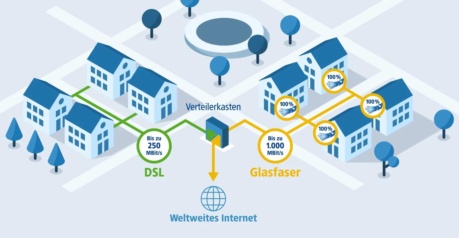 Mit einem Glasfaser-Direktanschluss steht die gewählte Geschwindigkeit jederzeit zu 100% uneingeschränkt zur Verfügung. Erfahren Sie mehr über Glasfaser und seine zahlreichen Vorteile.