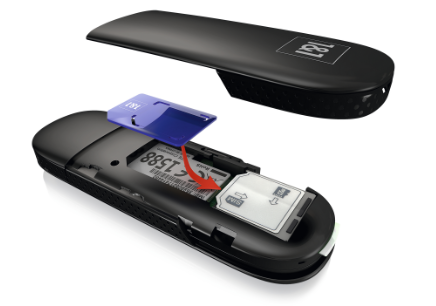 SIM-Karte mit dem Chip nach unten in die 1&1 LTE-Antenne einlegen und nach vorne schieben.